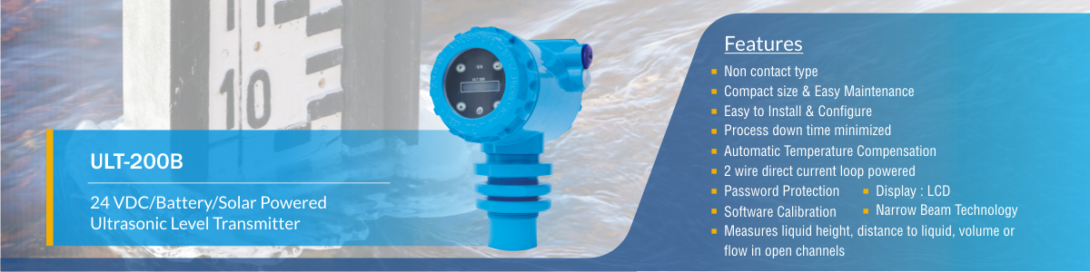 Electronet series ULT-200B is a Battery Operated Ultrasonic Level Transmitters specially designed for non contact type level measurement. Ultrasonic level measurement is based on the time required by ultrasonic pulses to travel from sensor and surface of liquid and back to sensor. Ultrasonic level transmitters are the best for applications such as slurries, corrosive liquids and waste water without obstacle throughout the beam. The transmitter provides local indication through LCD.